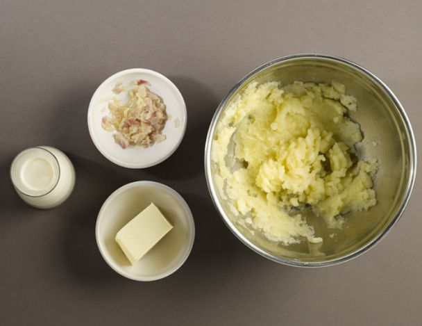 Faire chauffer la crème et le lait avec 500g de beurre.Pendant que la viande se termine et repose, faire la purée. Mettre les pommes de terres dans un moulin à légumes, en ayant pris soin de les avoir égouttées.