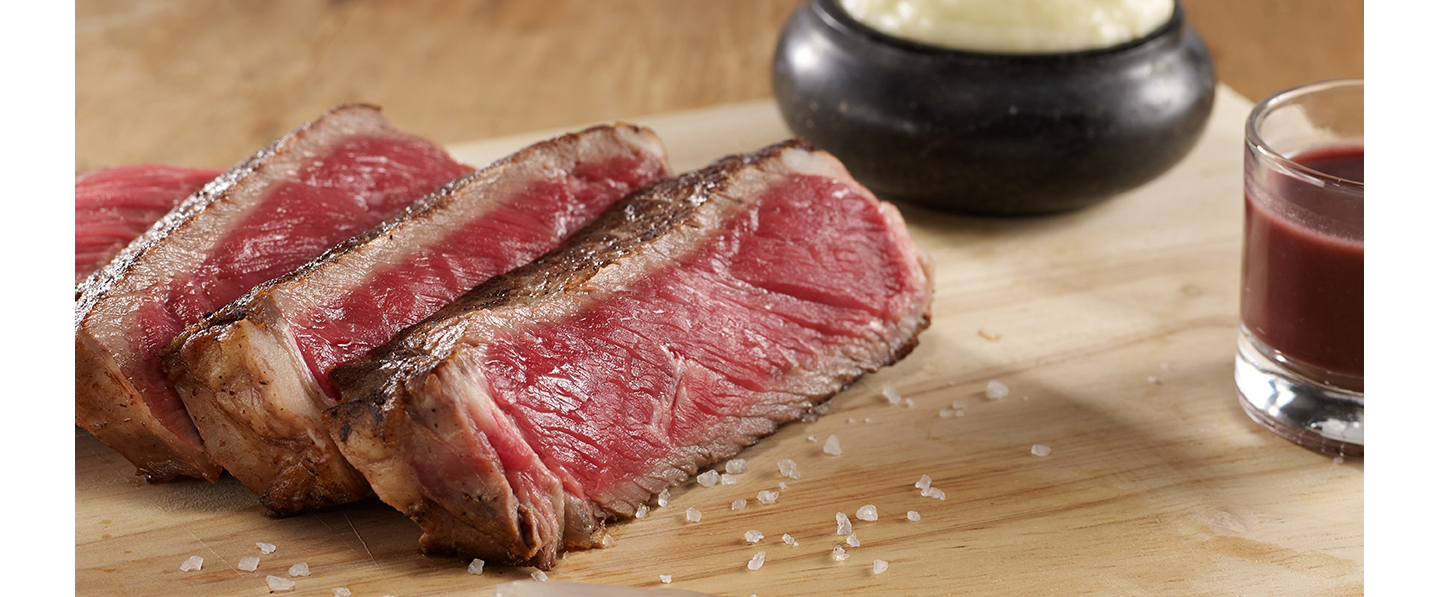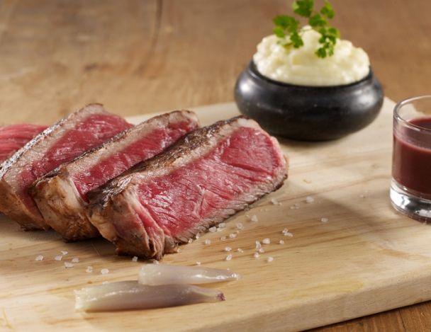 Prendre une grande planche en bois, tailler les entrecôtes en tranches épaisses. Les disposer sur la planche avec les échalote confites, la purée et la sauce à part (si vous n’avez pas de planche, un plat fera bien l’affaire !)