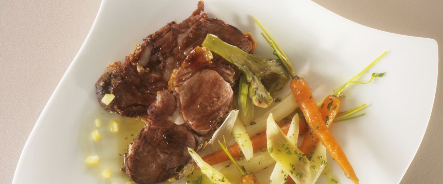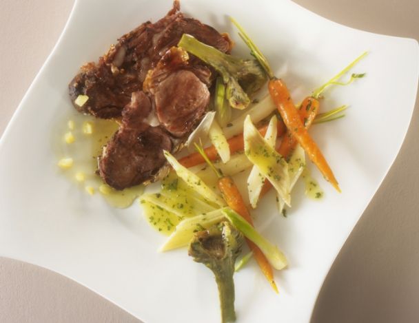 Découper l'agneau. Déposer l'agneau avec les légumes, arroser de jus autour.