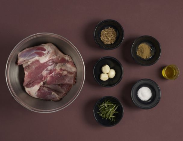 Frotter avec de l'ail l'épaule d'agneau. Badigeonner ensuite l'épaule d'huile d'oilve. Saler, Assaisonner avec les épices ( cumin, coriandre, romarin). Laisser mariner quelques heures minimum, une nuit au mieux.