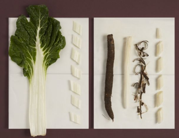 Cuire dans le blanc les cotes de blettes et les salsifis. Puis les glacer.