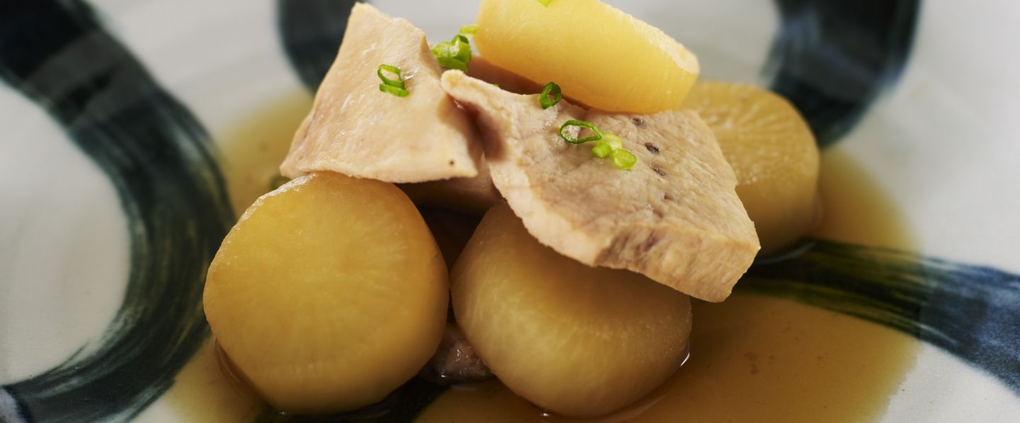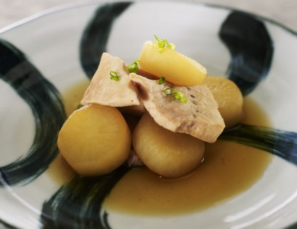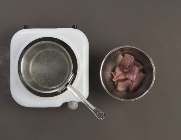 Découper l’espadon en morceaux de la même taille que le navet. Faire chauffer de l’eau. Mettre le poisson dans un bol. Saler l’espadon. Laisser reposer 10 mn, laver à l’eau froide, égoutter et verser de l’eau bouillante sur le poisson pour le recouvrir. Enlever l’eau chaude immédiatement