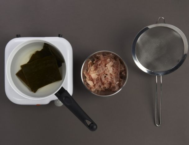 MoyenFaire chauffer à feu moyen l’eau et le konbu. A ébullition, enlever le konbu. Jeter dans l’eau bouillante la bonite séchée. Attendre à petit feu 15 secondes si la bonite est en copeaux, ou 20 mn si l'épaisseur des morceaux de bonite est de 1-2 mm. Passer au chinois très fin. Réserver