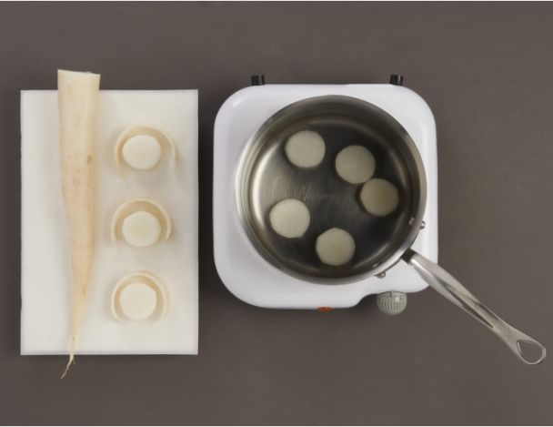 Eplucher le navet et le découper en morceaux d’épaisseur de 2 cm. Mettre dans une casserole le navet, recouvrir d’eau froide, chauffer à feu moyen. Cuire jusqu'à transparence du navet.