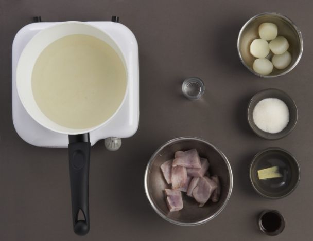 Dans une autre casserole mettre le dashi et le saké, amener à ébullition. Ajouter le poisson jusqu’au retour à ébullition.