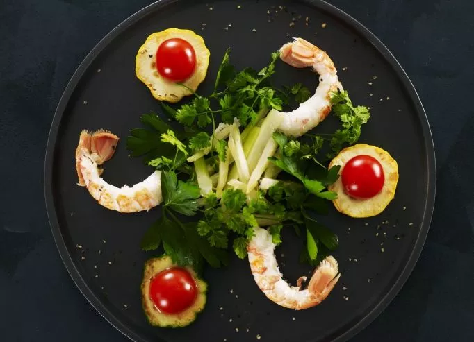 Dresser dans chaque assiette creuse. En finition ajouter quelques zeste de yuzu ou brins de ciboulette japonaise ciselés.