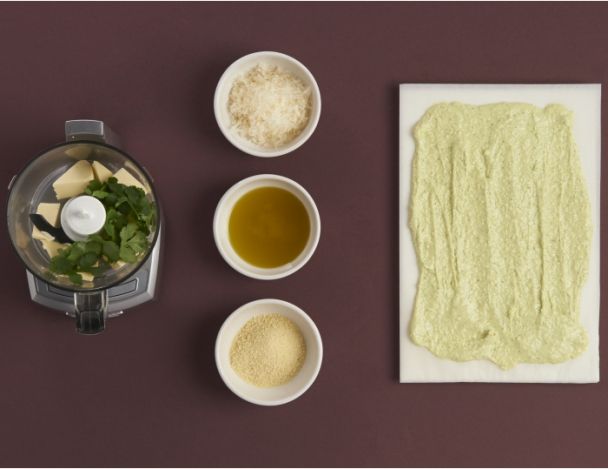 Mélanger le beurre, les herbes, la chapelure, l’huile d’olive, le parmesan, sel et poivre au mixeur pour obtenir une pâte, étaler ensuite sur du papier sulfurisé et faire durcir au congélateur.