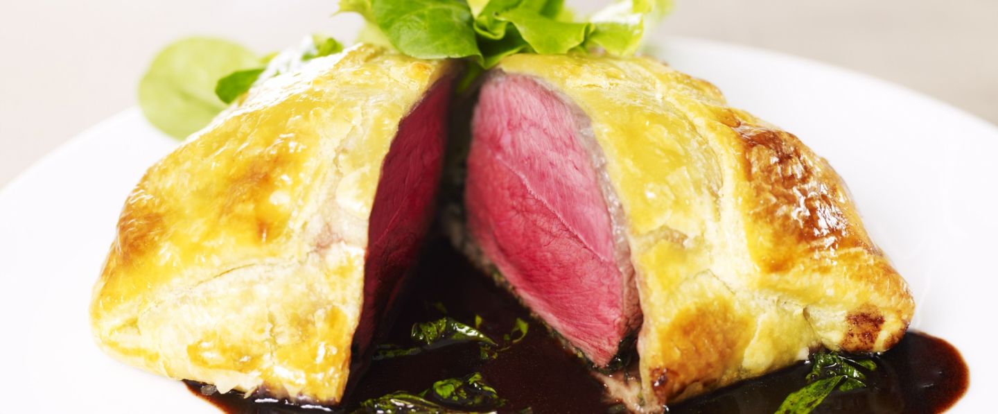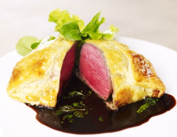 Au moment de servir: réchauffer les filets pendant 2 minutes au four, couper les filets de bœuf en deux et les recouvrir du jus fou d’herbes.