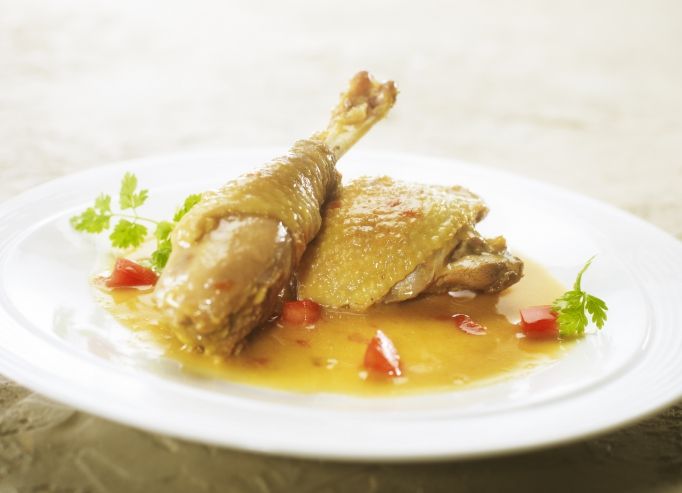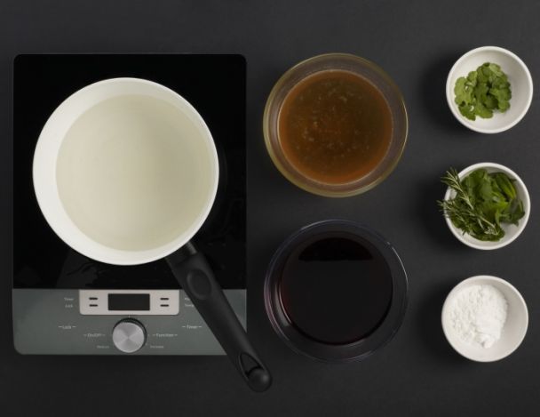 Verser dans une casserole, le ½ litre de bouillon de légumes, le ½ litre de bouillon de bœuf et le ½ litre de vin rouge, et la coriandre. Laisser réduire à moitié. Dans la sauce brûlante, verser le reste des herbes. Laisser infuser à couvert pendant 7 minutes. Si besoin, rectifier l’assaisonnement. Lier légèrement la sauce avec de la maïzena.