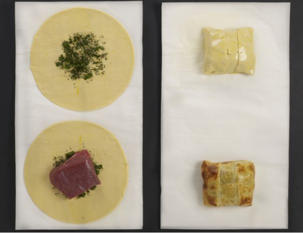 MoyenEtaler la pâte en tranche très fine. Couper 4 cercles assez grands.Hacher finement une partie des herbes. Les disposer au milieu du cercle de pâte. Sur les herbes, disposer les filets de bœuf préalablement salés et poivrés. Envelopper les filets de bœuf de pâte feuilleté de manière à former une aumônière. Dorer la pâte au jaune d’œuf. Cuire au four 5 min à 250°C.