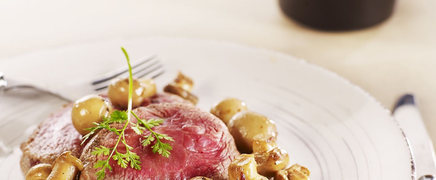 Trnacher le filet de bœuf. Servir accompagné des champignons et de la sauce.