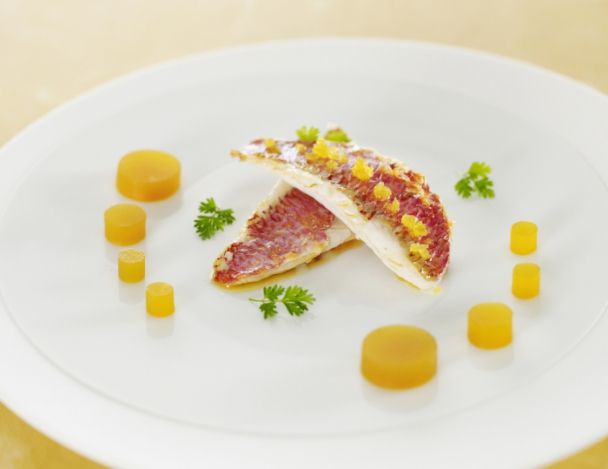 Egoutter les rougets, disposer des points de différents diamètre de gel safran, une pluche de fenouil et une pointe de fleur de sel.