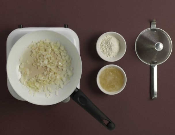 MoyenÉplucher et émincer finement les oignons. Les faire suer dans un grand sautoir chaud avec la graisse de canard. Puis, les faire colorer petit à petit jusqu’à ce qu’ils soient bien caramélisés, ajouter une demi-cuillère de farine et mouiller avec le fond blanc de volaille.