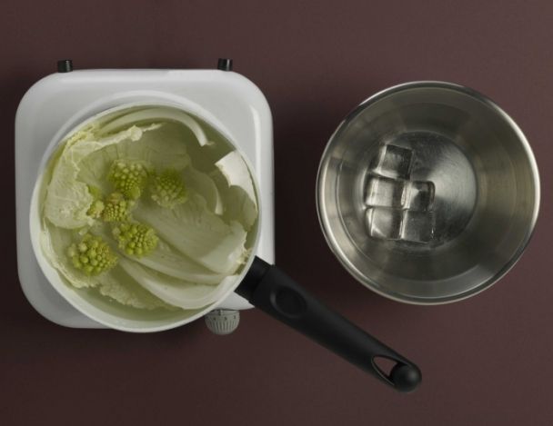 Cuire les sommités et les bok choy (seulement la partie inférieure) dans de l’eau bouillante salée, puis les plonger dans de l’eau glacée afin de stopper la cuisson .