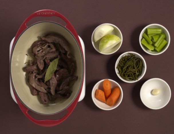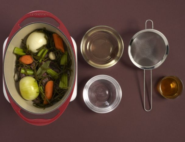 Retirer les aromates ,ainsi que les légumes ,et verser le contenu de la cocotte dans un cul de poule, et y verser le cognac.