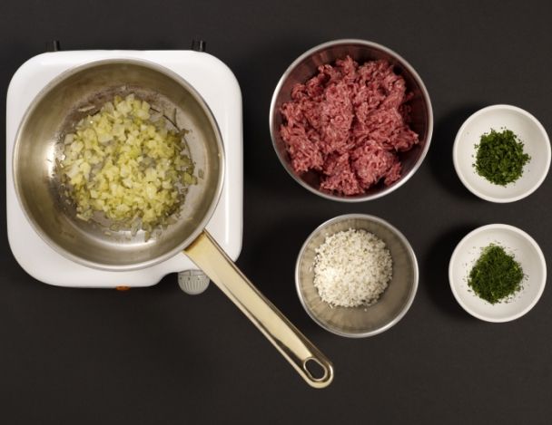 Laver le riz à l'aide d'un chinois et réserver. Mélanger à la spatule en bois l’oignon froid avec 100 g de viande de bœuf hachée, incorporer ensuite successivement 50 g de riz rond égoutté, 1 cuillère à soupe de persil plat concassé et 1 cuillère à soupe d’aneth concassé, assaisonner à convenance de sel fin et poivre du moulin.