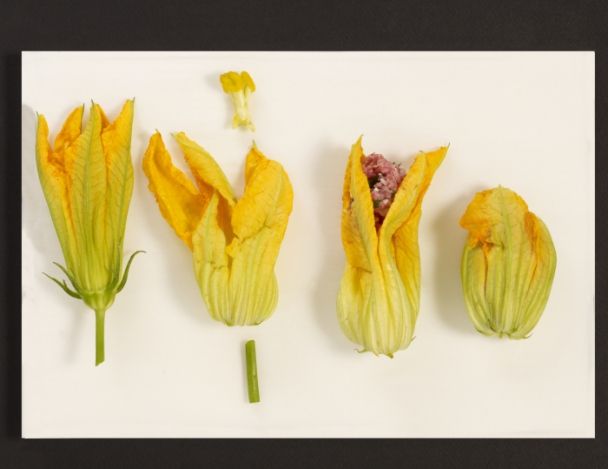Nettoyer soigneusement 6 fleurs de courgette avec un linge humide, retirer le pédoncule et le pistil.