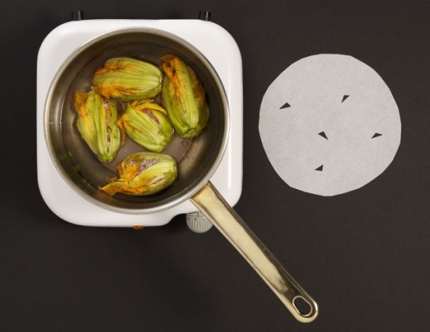 Disposer ces fleurs farcies en les espaçant dans un poêlon. Les recouvrir à hauteur d’eau, ajouter 1 filet d’huile d’olive, couvrir d’un papier sulfurisé avec quelques encoches, amener à frémissement et laisser cuire 40 minutes sur feu doux.