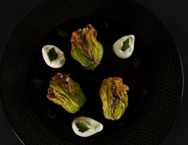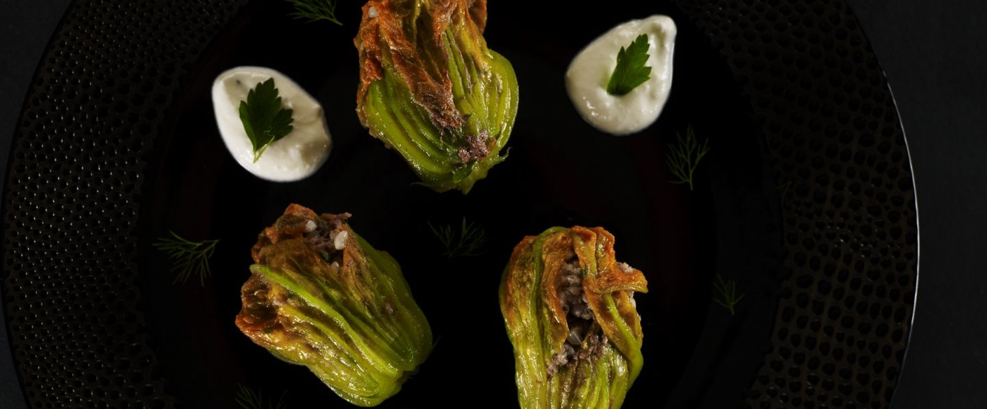 Étaler un fond de sauce au yaourt sur 2 assiettes de service, répartir harmonieusement dessus les fleurs de courgette farcies et ajouter un cordon du jus de cuisson. Servir et déguster sans attendre.