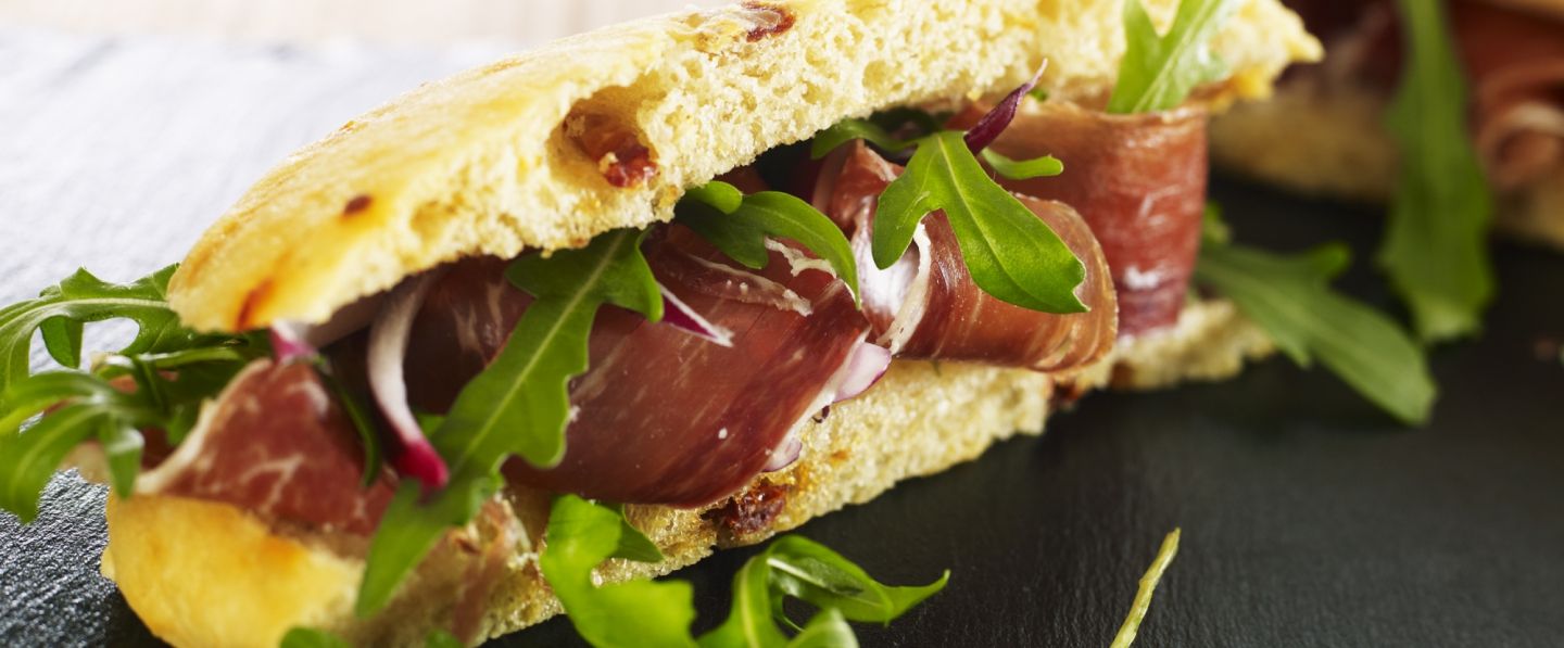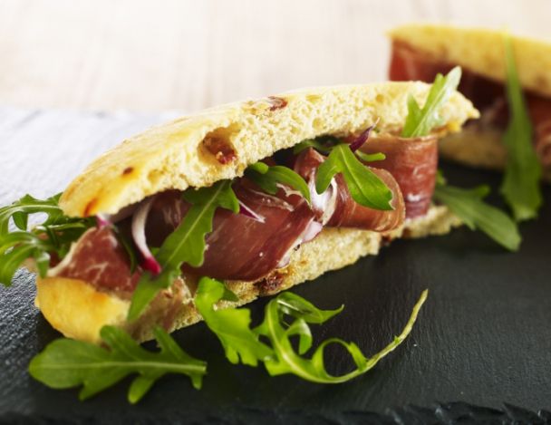 La focaccia, fougasse italienne, peut être une idée originale de sandwich de luxe. Moelleuse pour sa mie, la focaccia aux tomates confites et jambon ibérique peut être aussi bien toastée que légèrement chauffée au four.