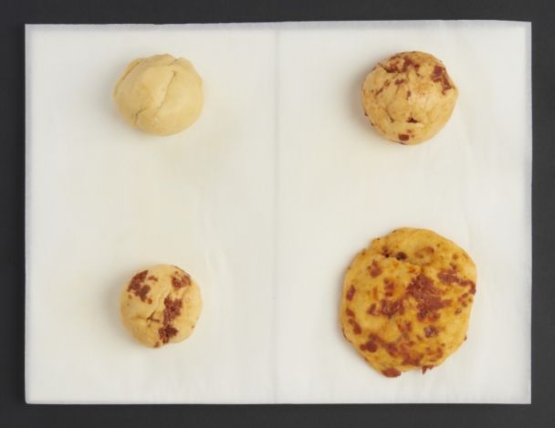 Disposer les pâtons sur du papier de cuisson, et enfourner pendant 15minutes. Sortir du four et laisser reposer au moins deux heures jusqu’à complet refroidissement avant de trancher.