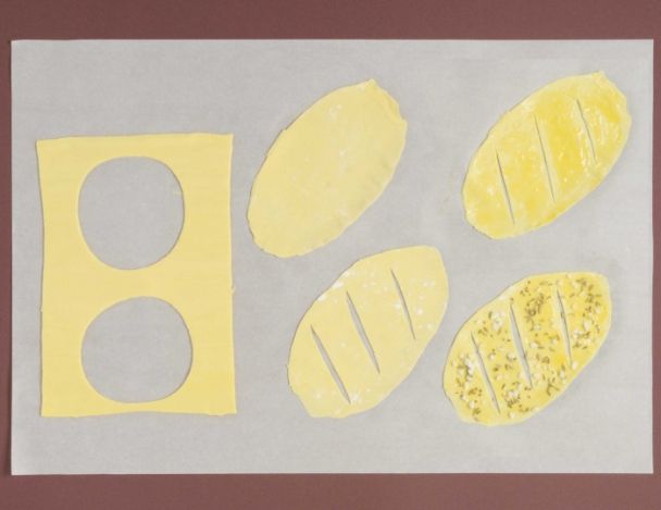 MoyenPréchauffer, le four à 180 °C (th. 6). A l'aide d'un emporte-pièce (ou avec un verre retourné), découper des ronds dans la pâte feuilletée déroulée, puis les étaler un peu en ovale.