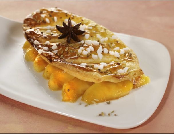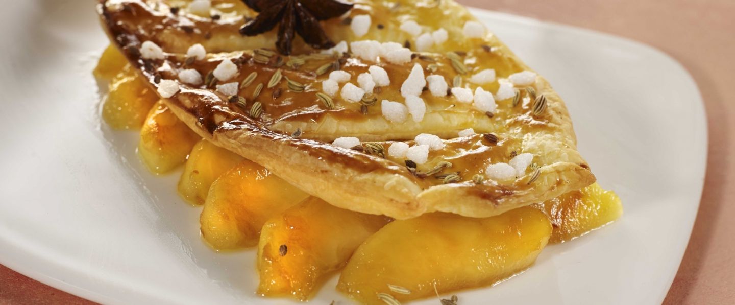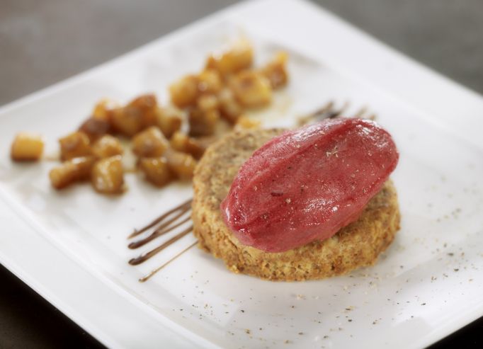 Au dernier moment, servir un quartier de pomme sautée tiède et déposer la fougasse croustillante sur le dessus, collée avec une cuillerée de glace à la vanille.