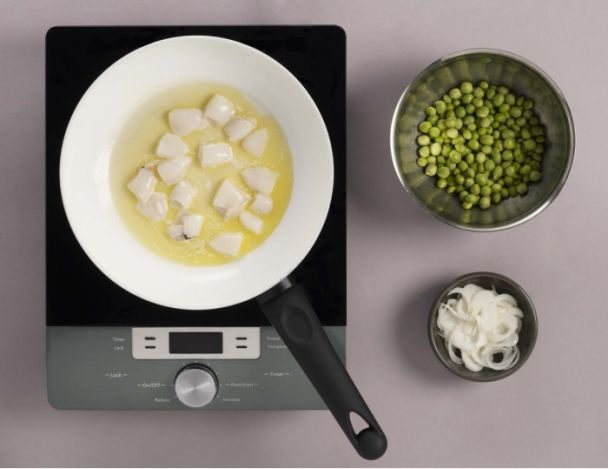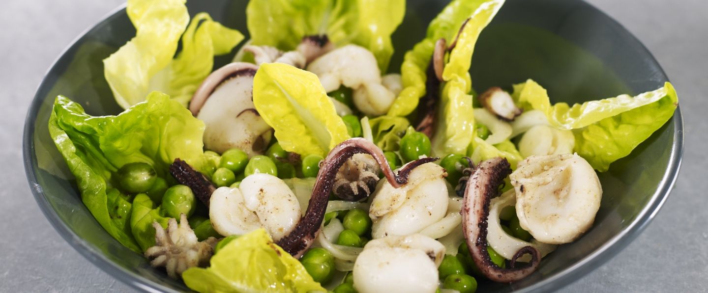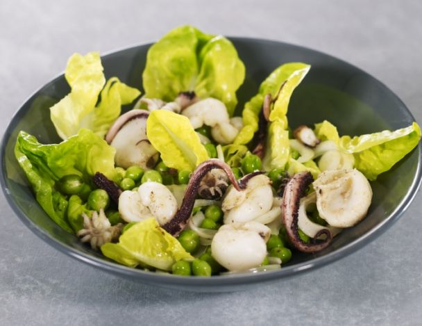 Faire fondre 30 g de beurre demi-sel dans une sauteuse et faire revenir les encornets pendant 2 à 3 minutes. Ajouter les petits pois et les oignons émincés, laisser cuire encore 3 minutes. Poivrer, vérifier la teneur en sel (le beurre demi-sel doit déjà saler le plat).