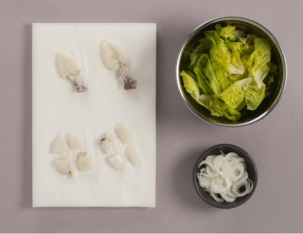 FacileNettoyer les encornets en retirant l'intérieur, le bec et les yeux. Les laver et les égoutter. Couper les encornets en gros morceaux. Éplucher les oignons nouveaux et les tailler en fines lamelles. Laver le cœur de laitue dans un bac d'eau en l'effeuillant. Egoutter bien.