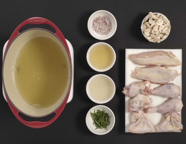 Bouillon aromatique : Dans 25 cl de fond blanc ajouter les échalotes ciselées, le Noilly Prat, le vin blanc, l’estragon et les champignons émincés .Laisser mijoter 10 minutes environ, puis plonger nos morceaux de volaille assaisonnés et cuire 12 minutes.