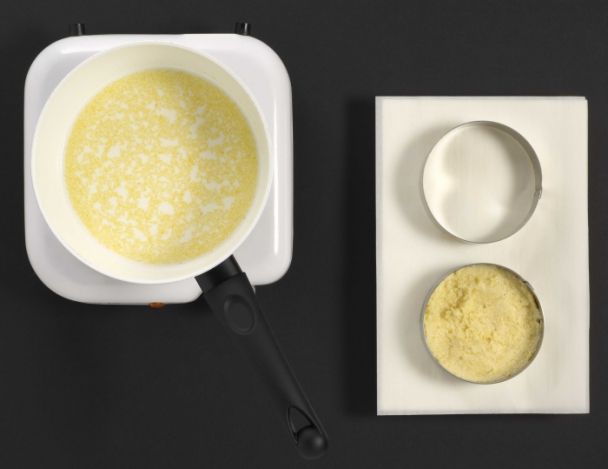 Mettre à chauffer le lait et la crème, assaisonné. Verser la semoule en pluie sur le liquide bouillant et remuer sans discontinuer, 5 minutes .Couler la polenta sur 1 cm d’épaisseur dans un cercle de 7cm de diamètre et faire prendre au frais.