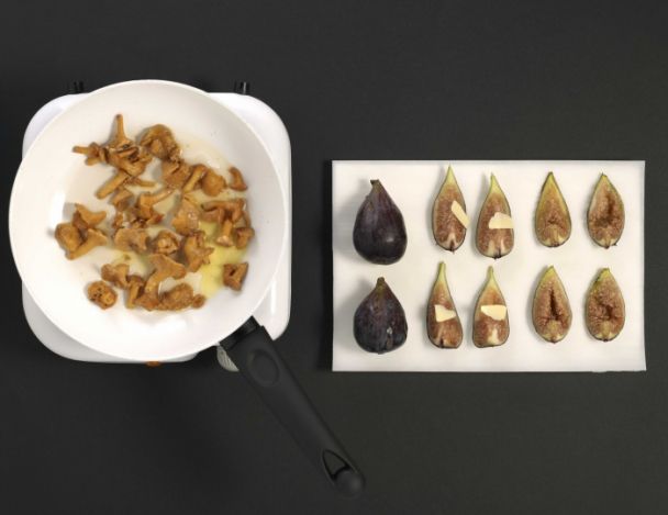 Tailler les figues en quatre, les mettre dans une plaque avec un petit cube de beurre sur chaque quartier. Cuire les marrons à l’eau, les éplucher et les tailler simplement en deux selon la grosseur. Nettoyer les girolles et les faire sauter au beurre. Laver les pousses d’épinard.
