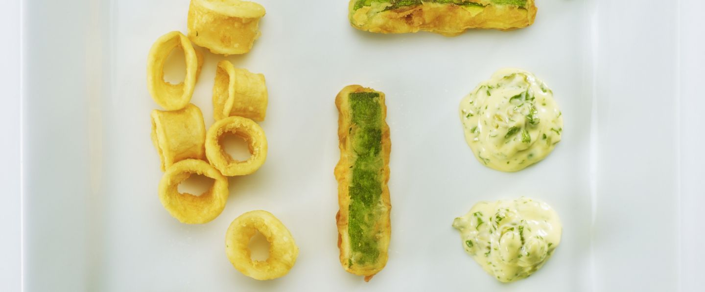 Mettre sur les assiettes, le demi-citron, la sauce tartare, les calamars, le persil et les courgettes frits. Servir