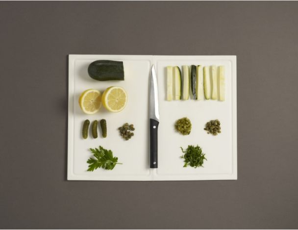 Tailler les courgettes en forme de frites et les citrons en deux. Hacher le persil, les capres, les cornichons.