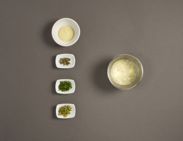 Monter la mayonnaise avec la moutarde, l'œuf et l'huile. Une fois bien ferme, terminer en ajoutant les câpres, les cornichons, et le persil. Réserver dans des ramequins au frais.