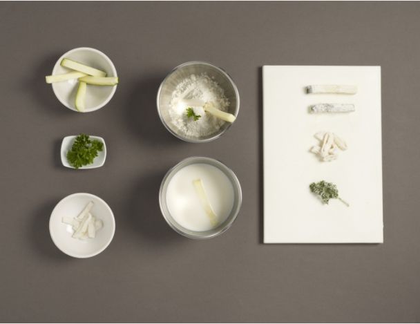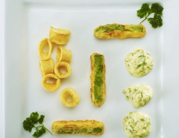 Tremper les courgettes dans du lait. Fariner les légumes: courgettes, calamars, persil.