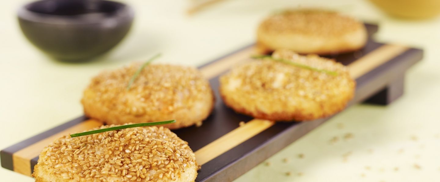 Dans un grand plat, déposer les graines de sésame en les répartissant. Déposer la préparation à base de crevette sur les disques de pain. Prendre chaque bouchée et la retourner de façon à les enrober de graines de sésame sur la garniture.