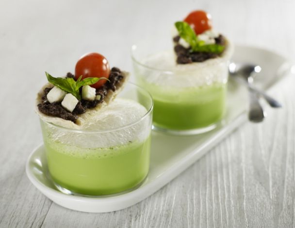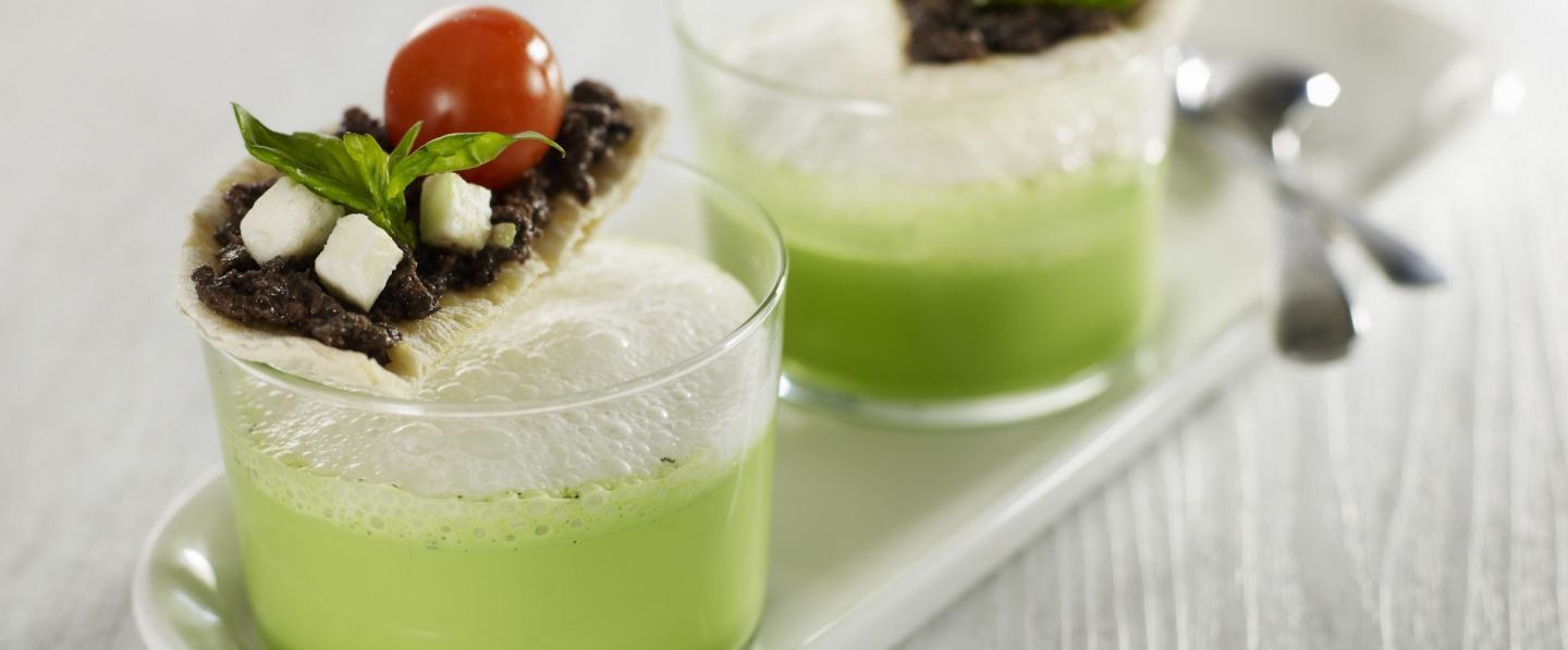 Verser le gaspacho de tomates vertes dans les verrines, couvrir avec l’espuma Mozzarella. Accompagner avec les tranches de foccacia Riviera.