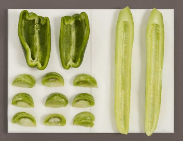 Enlever les graines du poivron vert et les parties blanche, le rincer sous l’eau.