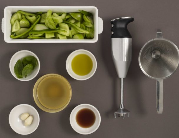 Dans une terrine réunir tous les légumes, les feuilles de basilic, l’ail épluché, le bouillon de légumes, le Xéres et l’huile d’olive. Assaisonner, réserver 6 heures au frais.