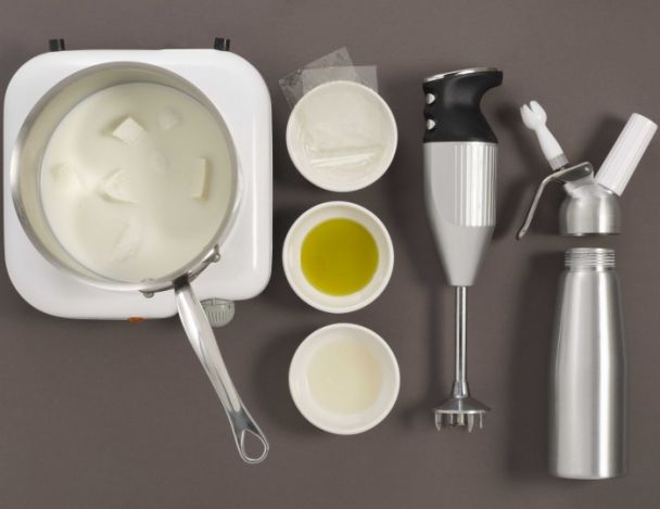 Verser la préparation dans un siphon et incérer 2 cartouches de gaz. Réserver au frais.