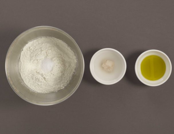 Dans la cuve mélanger la farine et le sel. Délayer la levure dans l’eau tiède, verser le mélange sur la farine. Ajouter l’huile d’olive.