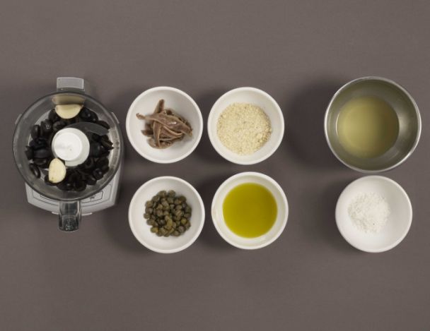 Mixer les olives, les gousses d'ail, les anchois, les câpres et la poudre d'amande. Monter avec l'huile d'olive et assaisonner.
