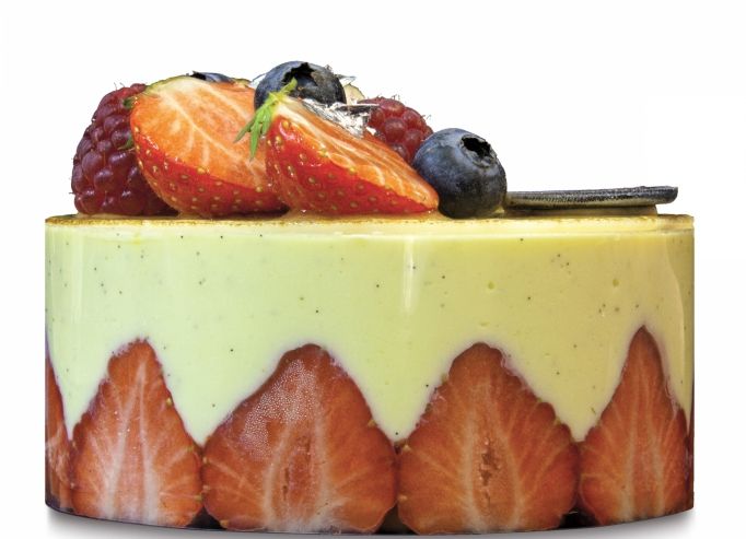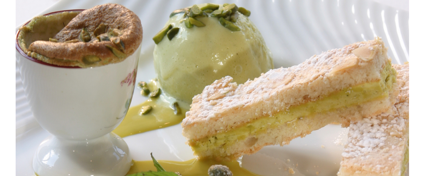 Mélanger avec le beurre en pommade et la pâte à pistache et étaler sur une moitié du fond de pâte.