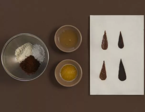 Mélanger le tout et laisser reposer pendant 1 heure au frigo. Ensuite étaler la pâte sur un silpat à l’aide d’un pochoir en forme de feuille. Mettre au four à 160°C pendant 8 à 10 minutes.