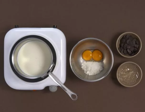 Faire bouillir le lait et la crème. Mélanger les jeunes d’œuf et le sucre. Verser le liquide bouillant sur la base jaune d’œuf et sucre. Cuire à l’anglaise. Ensuite verser sur le chocolat avec une feuille de gélatine. Bien mélanger et réserver au frigo avec un papier film au-dessous, pendant 2h. Pour le dressage, mettre dans une poche.