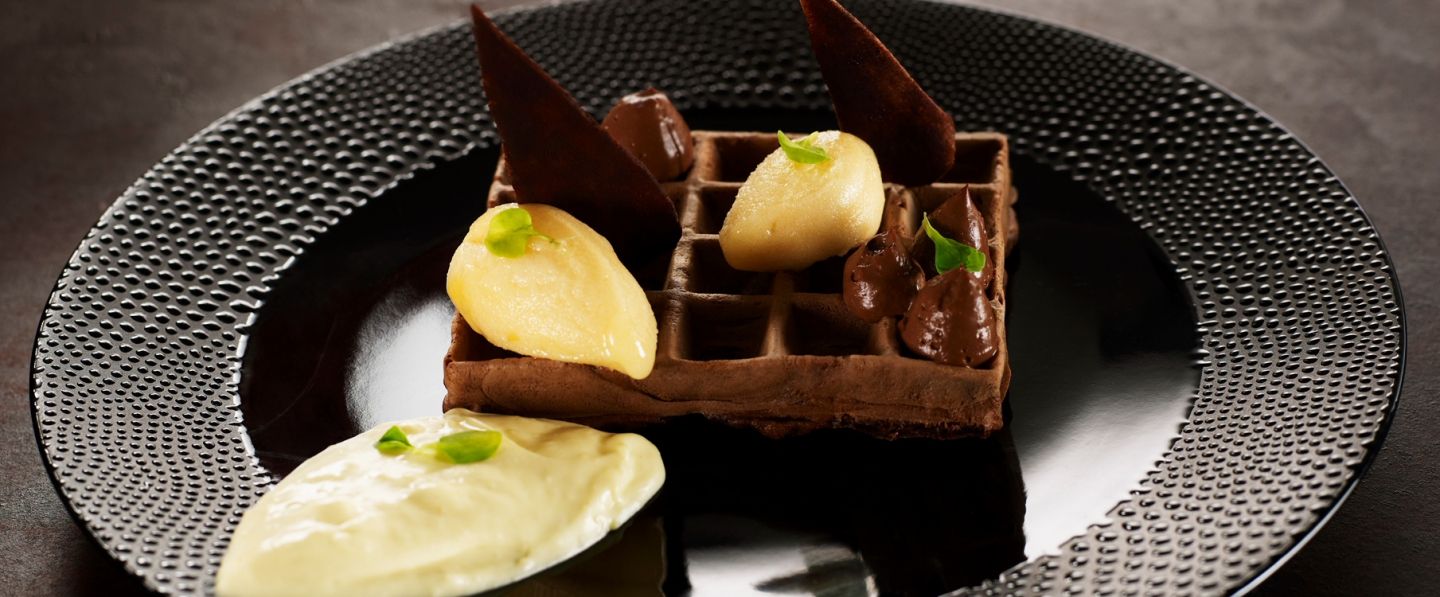 Précuire les gaufres dans un gaufrier bien chaud à 200°C durant 2 à 4 minutes et à la sortie saupoudrer les gaufres de cacao. Étaler à l’aide d’une cuillère la crème surprise sur l’assiette. Disposer la gaufre au centre et ajouter des points de crème chocolat. Par dessus mettre les boules de sorbet orange et disposer les tuiles. Ajouter un peu de lemon cress.