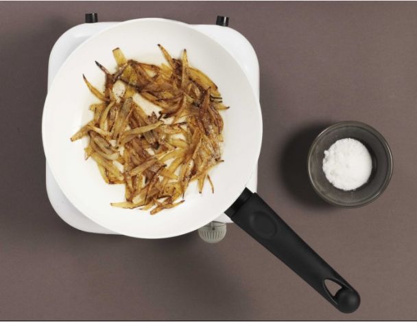 Émincer les oignons en long puis les faire colorer doucement au beurre avec une pointe de sucre et les faire caraméliser à feu doux.