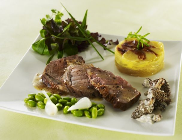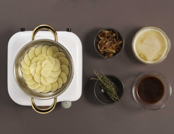 Disposer une première couche de pommes de terre en corolle et bien ranger dans un sautoir, beurrer et assaisonner. Puis rajouter les oignons confits sur le dessus et répéter 3 fois jusqu'à finir par les pommes de terre. Rajouter un peu de thym et rajouter 10cl de fond blanc de volaille chaud et 15cl de jus brun.