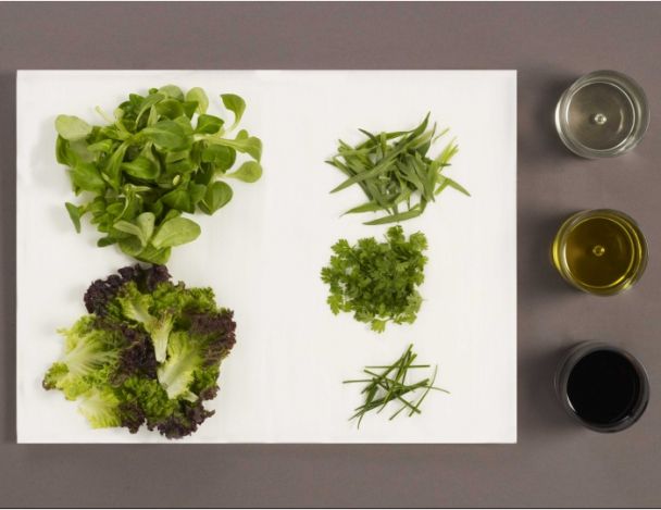Effeuiller les salades (mâche et cœur de rougette). Effeuiller les herbes : Estragon, cerfeuil, ciboulette. Réaliser une vinaigrette avec les huiles et le vinaigre et assaisonner avec les herbes et salades.